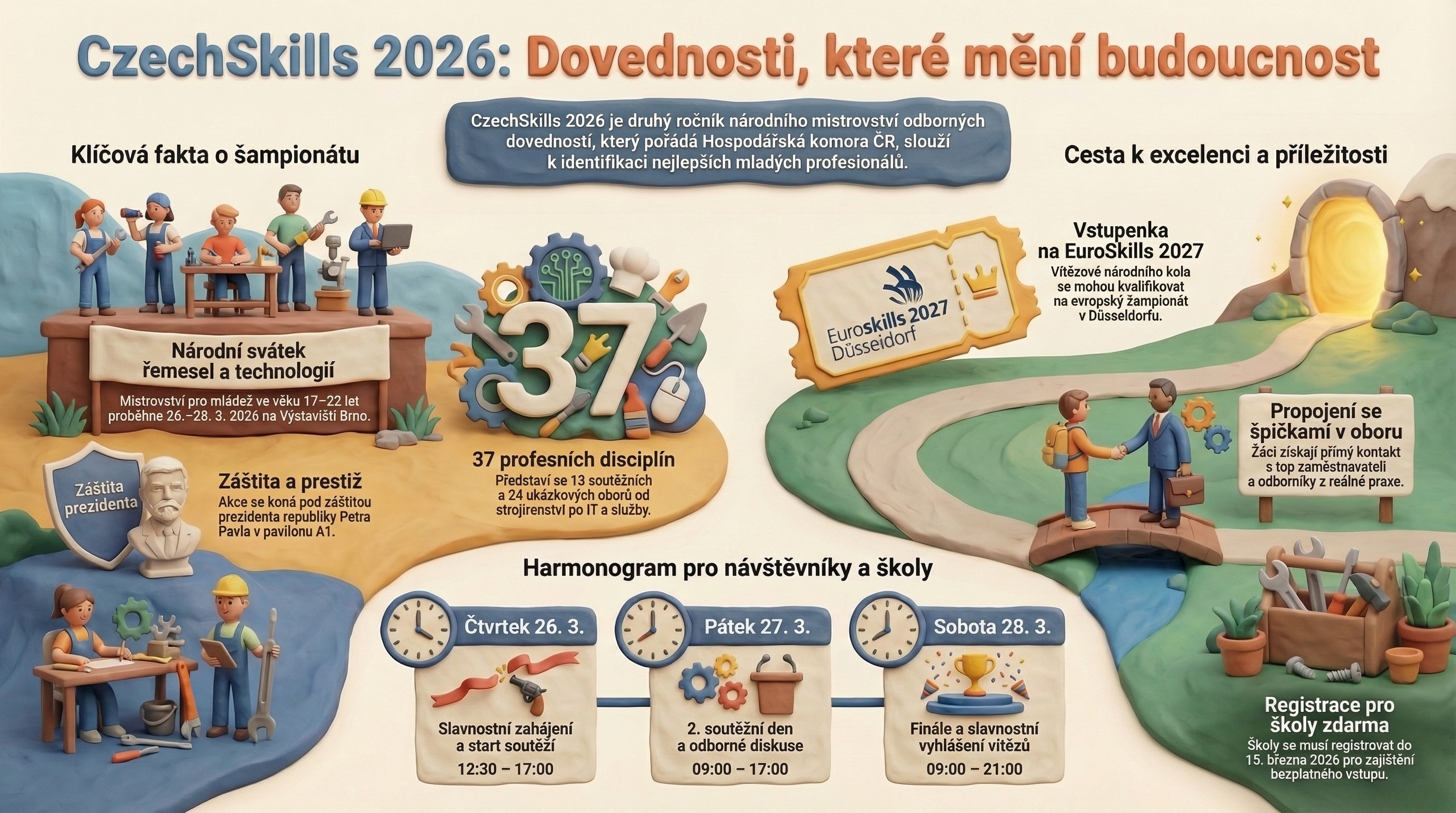 Základní přehled o akci, jejím programu i významu pro mladé talenty ukazuje také přiložená infografika. Přehledně zachycuje termín a místo konání, hlavní milníky soutěže i příležitosti, které CzechSkills otevírá studentům, školám a budoucím profesionálům.