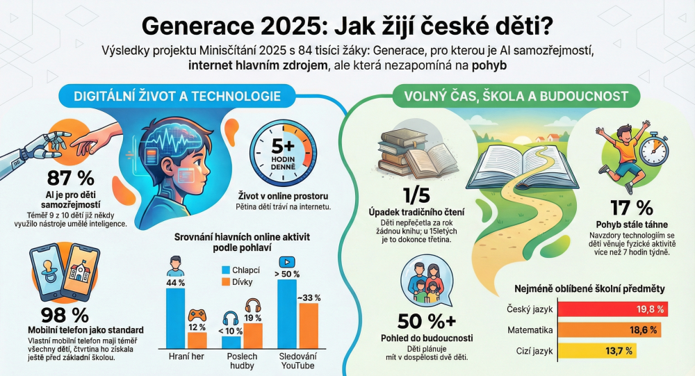 Minisčítání 2025 nám ukazuje generaci, která je v mnoha ohledech technologicky zdatnější, než byli jejich rodiče. Jsou to lidé, kteří AI považují za běžný nástroj a internet za nezbytnost, ale zároveň v patnácti letech pociťují takový tlak, že jejich největším přáním je zastavit čas. Dokážeme jako dospělí udržet krok s dětmi, pro které je kniha volitelným doplňkem, ale připojení k síti základním právem?