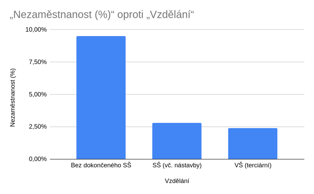 Nezaměstnanost mladých podle vzdělání. U věkové skupiny 25–34 let je v ČR nezaměstnanost: 9,5 % bez dokončené střední školy, 2,8 % se střední školou a 2,4 % s VŠ. Rozdíly jsou výrazné a ukazují, že „maturita je minimum“ a VŠ je dalším krokem k nižšímu riziku nezaměstnanosti.