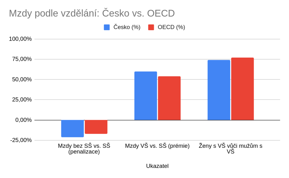 Mzdy podle vzdělání. Oproti středoškolákům vydělávají v ČR lidé bez maturity v průměru o 21 % méně, naopak vysokoškoláci o 60 % více. V průměru OECD je „trest“ za nedokončenou střední –17 % a prémie VŠ +54 %. Mezi vysokoškoláky navíc přetrvává genderová mezera: ženy s VŠ berou v Česku 74 % příjmu mužů se stejným vzděláním (OECD 77 %).