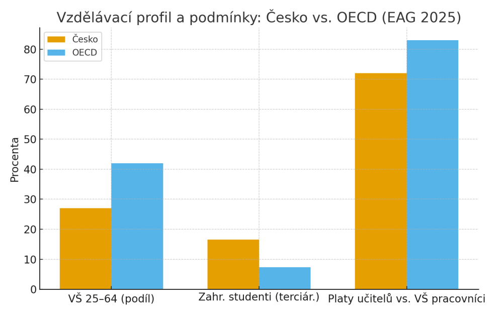 Graf 1: Vzdělávací profil a podmínky: Česko vs. OECD (EAG 2025)