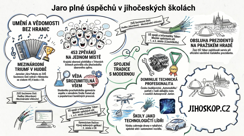 Na přelomu března a dubna ukazují jihočeské školy a vzdělávací instituce velmi široký záběr: od medailových umístění na uměleckých a odborných soutěžích přes výuku propojenou s praxí až po veřejné akce, besedy a nábor nových žáků. Vedle tradičních úspěchů v hudbě či řemeslných oborech zaujmou i momenty, kdy se studenti dostávají k mimořádným zkušenostem mimo školní lavice. Z aktuálního dění je patrné, že regionální školství nestaví jen na výkonu, ale také na aktivitě, otevřenosti a schopnosti reagovat na současná témata.
