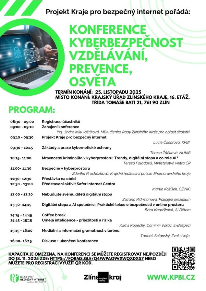 Projekt Kraje pro bezpečný internet (KPBI) zve odbornou i širokou veřejnost na tradiční Konferenci KPBI, která se uskuteční v úterý 25. listopadu 2025 na Krajském úřadě Zlínského kraje. Akce se zaměří na aktuální témata z oblasti kyberbezpečnosti, prevence a vzdělávání a nabídne účastníkům pestrý program plný inspirace i praktických zkušeností.
