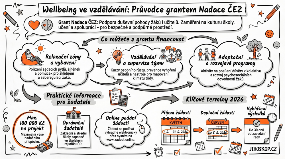 Základní a střední školy budou moci v květnu žádat o podporu z grantového řízení „Wellbeing ve vzdělávání“, které vyhlásila Nadace ČEZ. Program pomáhá vytvářet prostředí, které podporuje duševní pohodu žáků i vyučujících. Počítá s financováním relaxačních zón, vzděláváním pedagogů i posílením školních poradenských pracovišť. Maximální výše příspěvku činí 100 tisíc Kč.
