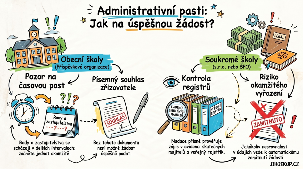 1. Obecní školy (příspěvkové organizace): Potřebujete písemný souhlas zřizovatele. Pozor na časovou past. Obecní rady nebo zastupitelstva se scházejí v delších intervalech. Pokud začnete souhlas řešit až v květnu, pravděpodobně termín nestihnete. Začněte jednat s radnicí okamžitě.