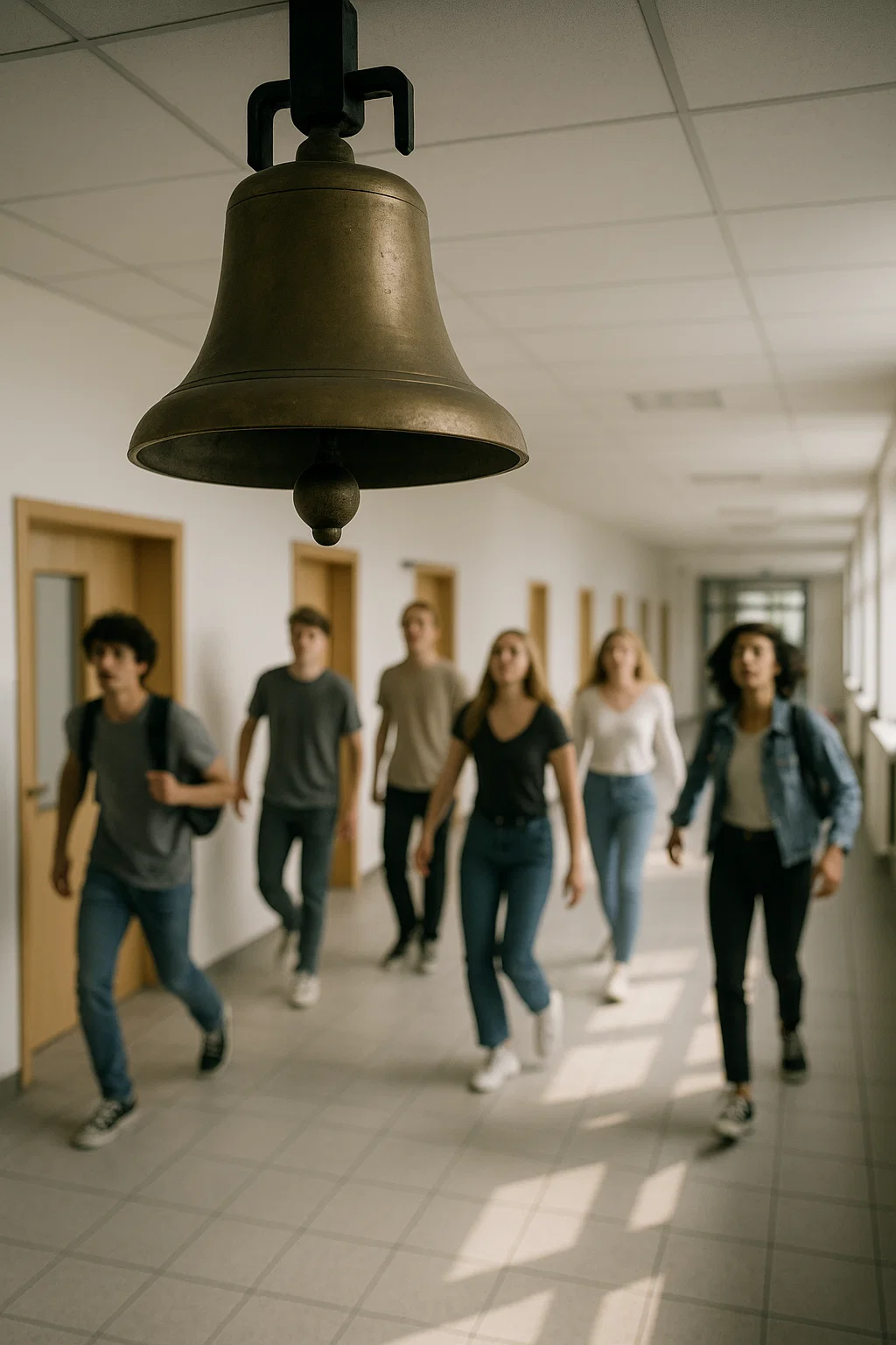 Zvonění se stalo naším neviditelným pánem. Určuje, kdy můžeme mluvit, kdy jíst, kdy přemýšlet a kdy dělat, že přemýšlíme. Všechno podle rytmu, který by klidně mohl používat vězeňský dozorce. A co je nejzajímavější? Když zvonek nezazvoní, nastane chaos. Nikdo neví, jestli má jít do jiné učebny, domů, nebo zůstat.