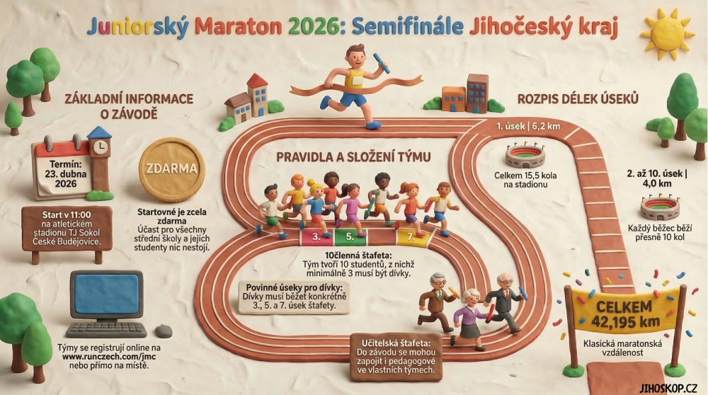 Pro mnohé studenty nejde jen o další sportovní akci. Juniorský maraton je příležitostí vyzkoušet si opravdový závod, zažít podporu spolužáků i učitelů a zjistit, jak daleko může člověka dostat odhodlání a týmová spolupráce. Jihočeské semifinále se poběží 23. dubna 2026 na Sokolském ostrově v Českých Budějovicích.
