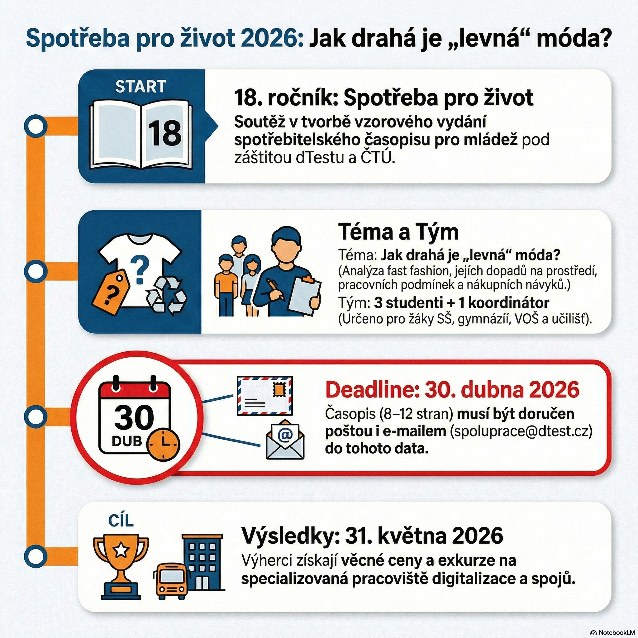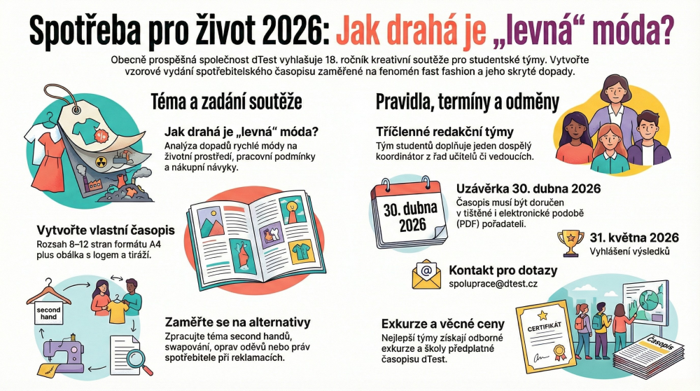 Máš na fast fashion názor? Chceš prozkoumat praktiky online tržišť, marketing na sítích nebo třeba otestovat kvalitu oblečení? Zapoj se do 18. ročníku soutěže Spotřeba pro život, kterou vyhlašuje dTest pod záštitou Českého telekomunikačního úřadu a psycholožky Romany Mazalové.